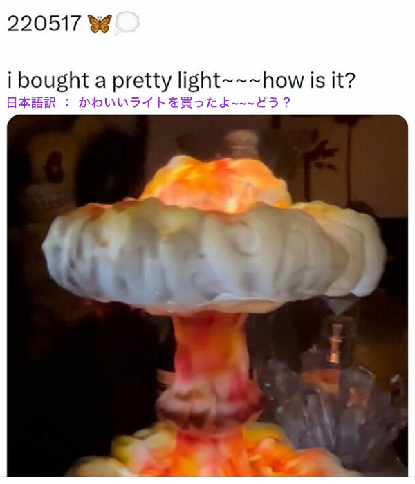 これは2022年5月17日、同メンバーのニンニン(中国出身)がファン向けアプリに”きのこ雲ランプ”の写真を投稿し「i bought a pretty light~~~how is it?(かわいいライトを買ったよ〜〜〜どう?)」と原爆を揶揄して書き込んでいたからです。
