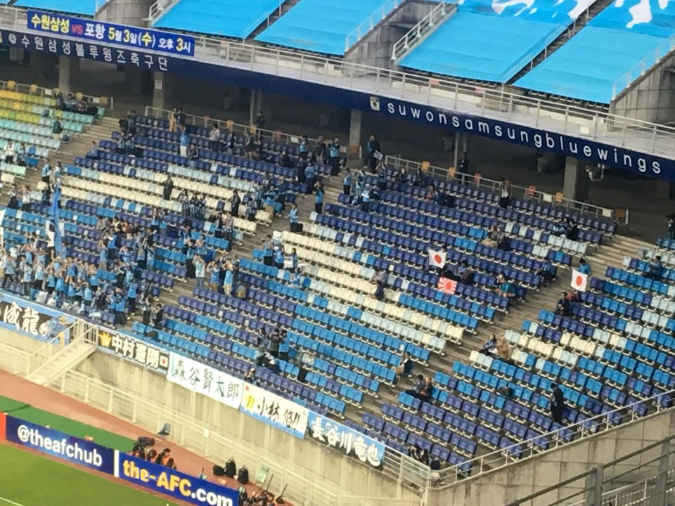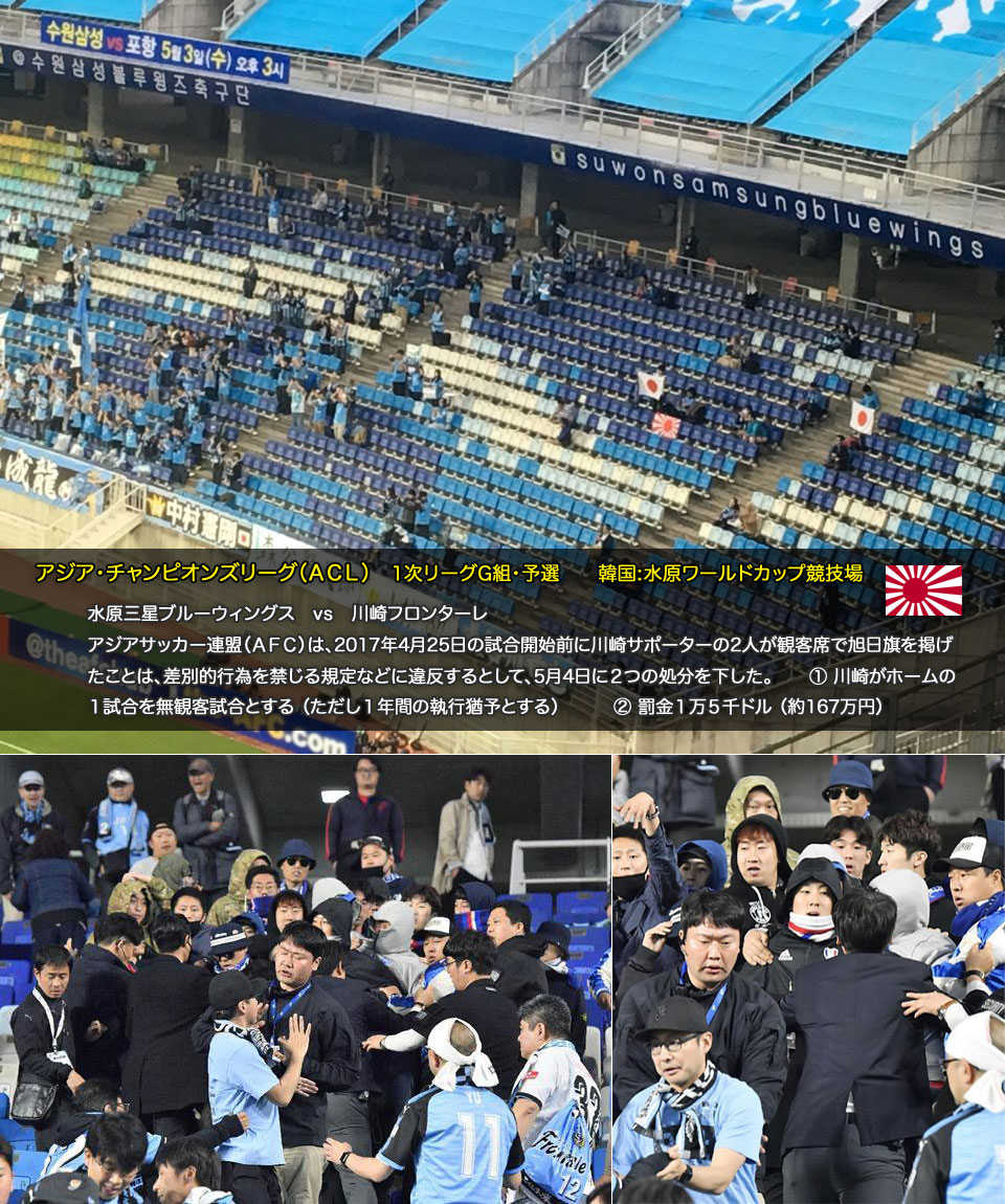 2017年4月に韓国で開催されたアジアチャンピオンズリーグ(ACL)グループステージ第5節、水原ワールドカップ競技場、4月25日の「川崎フロンターレ vs 水原三星ブルーウイングス」戦において、日本人サポーターが観客席で旭日旗を掲げてたことで、韓国人らが試合後に川崎側に乱入するという騒動が起こり韓国国内で大きな問題になりました。