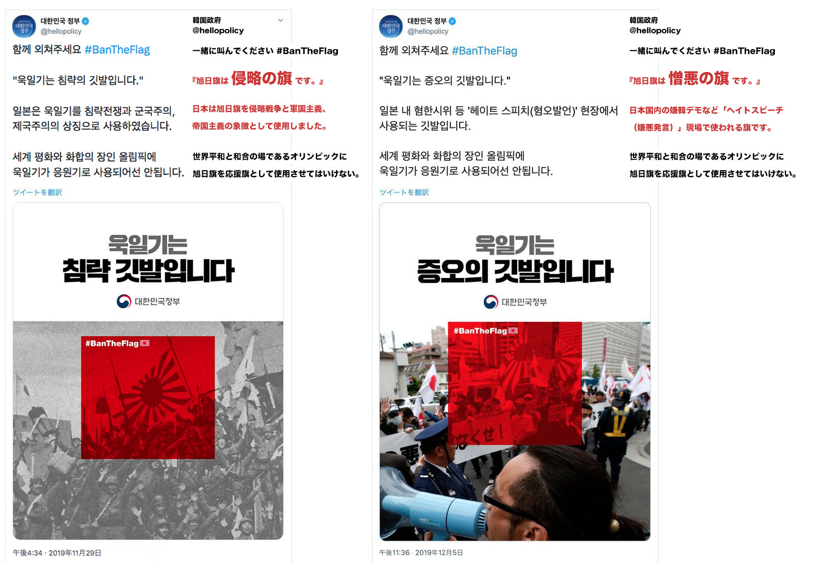 2019年11月29日、韓国政府は公式Twitter(現在X)で『旭日旗は侵略の旗』、12月5日には『旭日旗は憎悪の旗』であると2度にわたり『一緒に叫んでください』と拡散を目的とする反日プロパガンダを世界に発信しました。