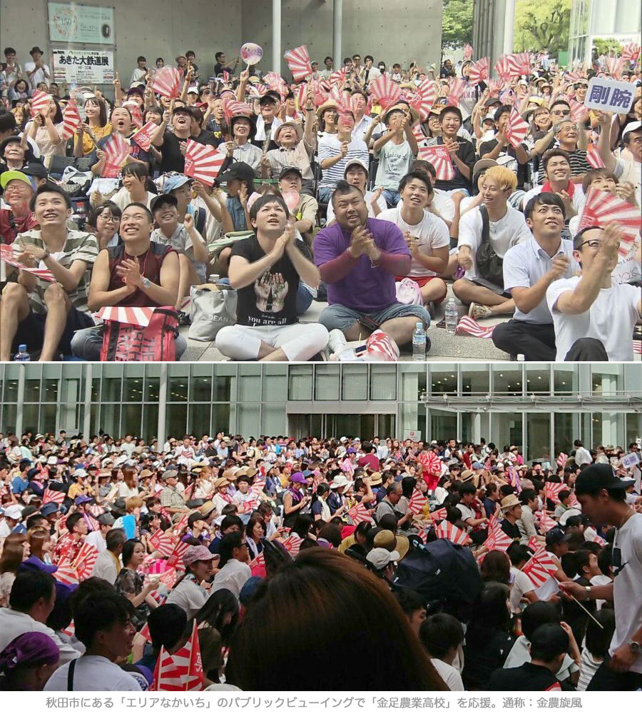 2018年8月に行われた第100回全国高等学校野球選手権記念大会で、秋田県代表の「金足農業高校」の快進撃を「金農旋風」といい、秋田市の「エリアなかいち」のパブリックビューイングには多くの県民が集結しました。