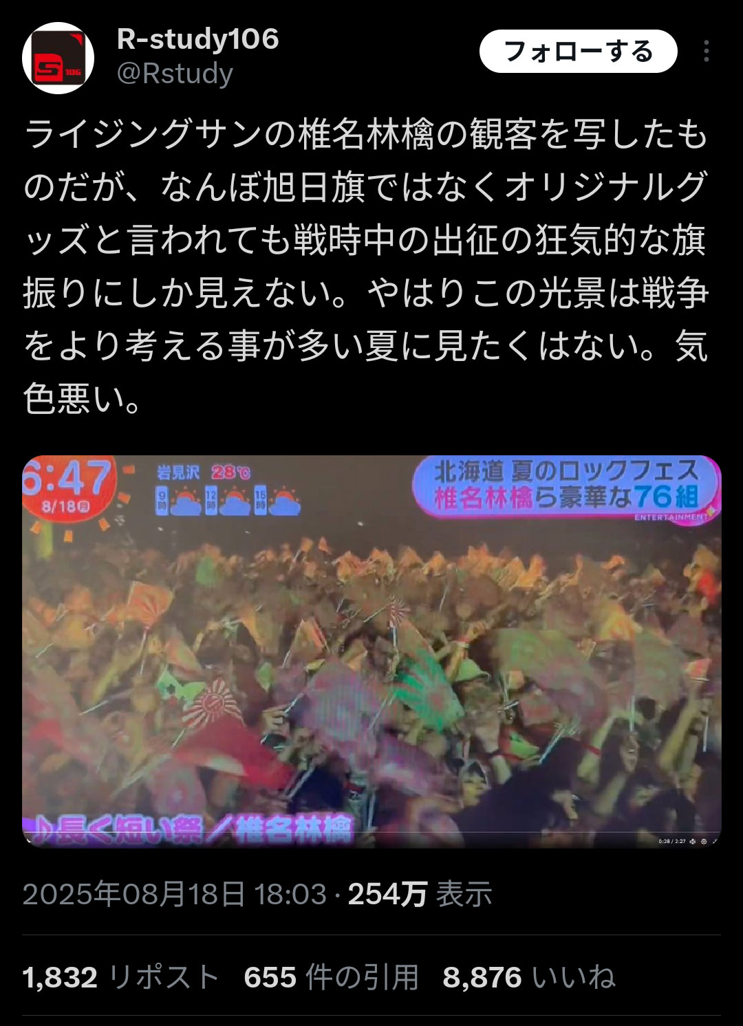 2025年8月15日-16日「ライジング・サン・ロック・フェスティバル・2025」で、17年ぶりに椎名林檎さんが出演。林檎ファンにはお馴染みの応援旗を振る映像がフジテレビ系の「めざましテレビ」「ノンストップ!」で紹介されたところ、これを観た日本人視聴者らがSNSで「…気持ち悪い」「痛い,ダサい,危険..」等々、次々に騒ぎ出しました。