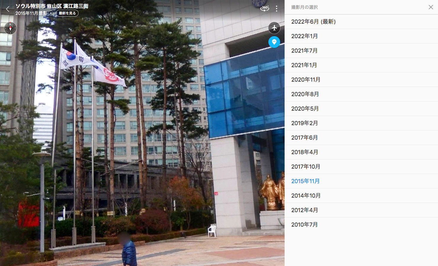 2015年11月に韓国NABERのMAPで撮影された、ソウル龍山区にある世界平和統一家庭連合の正面玄関先。韓国国旗(太極旗)と統一教会(旭日模様)の旗が仲良く横並びしていました。